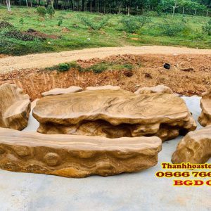 Bộ bàn đá vân gỗ sân vườn nguyên khối vân tự nhiên.